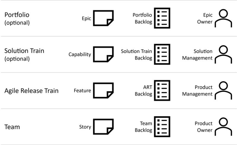 In the following, the discussion is limited to a two-level hierarchy without loss of generality; a transfer to more levels is straightforward. In addition, the term story is used for the smallest unit of requirements and epic for the next higher level, as these terms are more common in the agile community than those of the very SAFe-specific terminology. According to the terms used here, the Chief Product Owner (CPO) manages epics and is responsible for maintaining the Product Backlog, while Product Owners (POs) manage stories and maintain team backlogs.