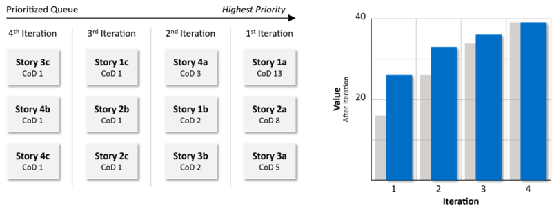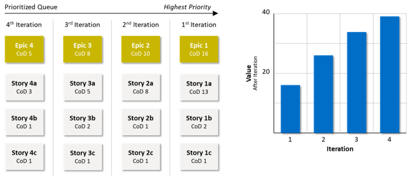 Figure 2 shows four prioritized epics, with epic 1 being the most valuable and epic 4 being the least valuable. For simplicity and without loss of generality, it is assumed that three stories have been derived from each epic and all these stories require the same implementation duration. Therefore, the assessed Cost of Delays (CoD) for the stories can be considered as the Weighted Shortest Job First (WSJF). The CoDs for the epics are determined by summing the CoDs of the assigned stories. Further, it is assumed that three stories are realized in one iteration. The cumulative business value after each iteration is shown on the right-hand side of Figure 2.