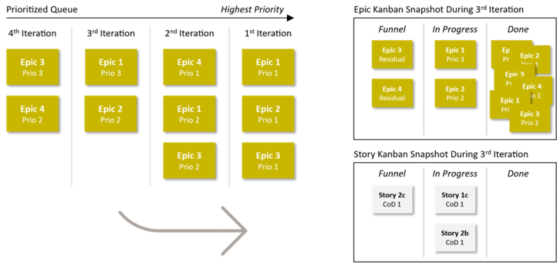 However, focusing solely on story priorities has one key drawback: the loss of transparency at the epic level. This is illustrated in Figure 4. Shown are two snapshots of (simplified) epic Kanban boards during the 3rd iteration based on the previously presented scenarios: on the left an implementation sequence according to epic priorities, on the right according to story priorities. A realization based on epic priorities provides a clear picture of the states of the epics. However, this is not the case with a realization based on story priorities: In the example, all epics are in the state of realization because at least some of their stories are in progress or already realized, but none of them have all their stories done. In general, implementing according to story priorities results in epics being stuck in a fuzzy WIP state, with no real overview of what has already been delivered and what is still waiting in the funnel and thus could be reprioritized, changed, or removed.