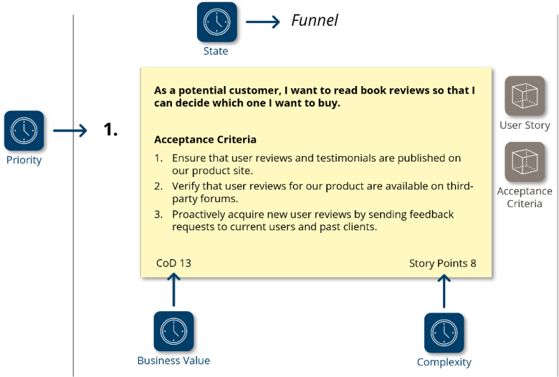 Requirements should be prioritized at the user story level: ‘Based on the value/effort ratio the Product Owner can select the stories that should be taken on by the developers in the next iteration.’[5, p. 71]. Nevertheless, to make it easier for management to trace progress, prioritization usually takes place at the epic level in practice. This is also recommended by scaling frameworks based on flight levels, such as SAFe. SAFe, for instance, requires the identification and scheduling of high-priority epics for the upcoming interval, and suggests tracking epics using a Kanban board[6]. This leads to a systematic postponement of high-priority stories and thus undermines the goal of realizing the most valuable requirements first: