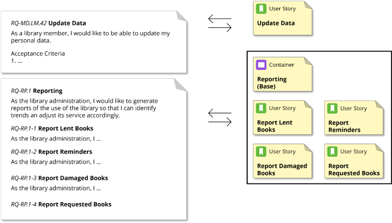 In this example, a library system is being developed. The PO of this system gathers requirements by interviewing library operators and other potential users. After one of these interviews, two requirements have been captured: updating personal data by library members and generating reports by the library administrator. The reporting requirement consists of a list of different types of reports, which are sub-requirements. The product owner describes the requirements in a document management system (left side of Figure 7), adds backlog items in a tracking system (right side of Figure 7), and links these items to the corresponding specification in the document management system. Thus, the requirements (epics and user stories) are described in the tracking system using the well-known user story formulation. This can be done either directly or by referencing the requirement in the document management system.