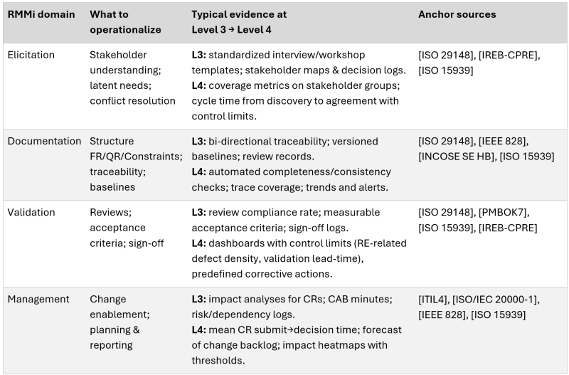 This staged approach gives organizations a clear roadmap. It shows not only where they are but also how to improve, while preserving comparability with other maturity frameworks. The distinction of the RMMi lies in applying this proven maturity model logic to the domain of requirements engineering, with practices, criteria, and indicators tailored to the characteristics of elicitation, documentation, validation, and management.